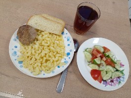 18.12.2025 - котлета мясная, макаронные изделия отварные, компот из сухофруктов, хлеб пшеничный, салат из свежих помидор и огурцов