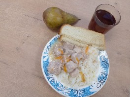 19.12.2025 - гуляш, рис отварной рассыпчатый, хлеб пшеничный, чай с сахаром, груша