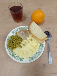 17.12.2025 - котлеты из минтая, картофельное пюре, напиток из шиповника, хлеб пшеничный, апельсин,