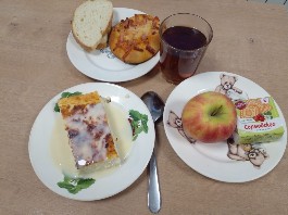 18.11.2025 - запеканка творожная молоком сгущеным, чай с сахаром, батон нарезной, сок, печенье пшеничное, батончик суфле